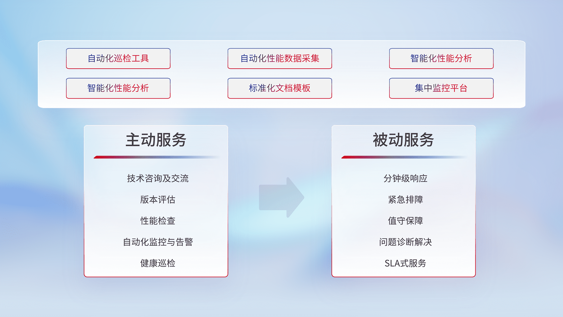 智能化工具和标准化文档,,保障服务质量,,,提供主动服务(包含技术咨询、、版本评估、、、性能检查、、自动化监控与告警、、、、健康巡检)和被动服务包含(分钟级响应、、、、紧急排障、、、、值守保障、、、问题诊断解决、、、、SLA服务)。。。。
